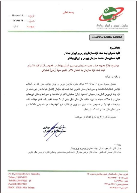 در این نامه آمده است طبق مصوبه 3 آبان 1400 هیات مدیره سازمان بورس و اوراق بهادار مقرر شد در راستای افزایش شفافیت اطلاعات و صورتهای مالی ناشران ثبتشده نزد سازمان بورس شامل شرکتهای درجشده در بازار پایه فرابورس ایران در صورتی که سود و زیان عملیاتی ناشر در اطلاعات و صورتهای مالی دورهای میانی و یا سالانه نسبت به دوره مشابه سال مالی قبل بیش از 30 درصد تغییر یابد، ناشر موظف است توضیحات خود را در مورد علت تغییر سودآوری در قالب فرم توضیحات در خصوص اطلاعات و صورتهای مالی منتشر نماید.