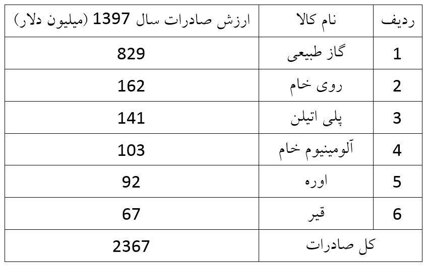 جدول 1 – 6 قلم اول صادرات ایران به ترکیه