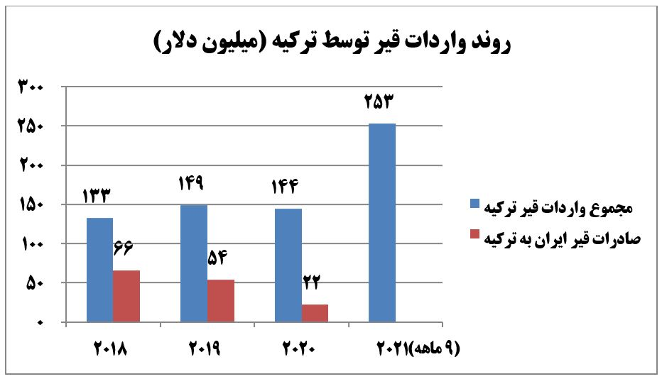 سیاست اتخاذ شده از سوی دولت اردوغان به بخش قابل توجهی از بازار صادراتی ایران آسیب میزند. طبق آمار گمرک ایران در سال 1397، حدود 361 هزار تن قیر نفت به ارزش 98 میلیون دلار به ترکیه، گرجستان و قبرس صادر شده است که 11 درصد از بازار صادراتی قیر کشور را تشکیل میدهد. براساس آمار مرکز تجارت جهانی، سهم ایران در بازار قیر ترکیه در طول سال های 2018-2020 علی رغم افزایش واردات ترکیه، کاهش داشته و در سال 2021 به صفر رسیده است (تصویر 1).