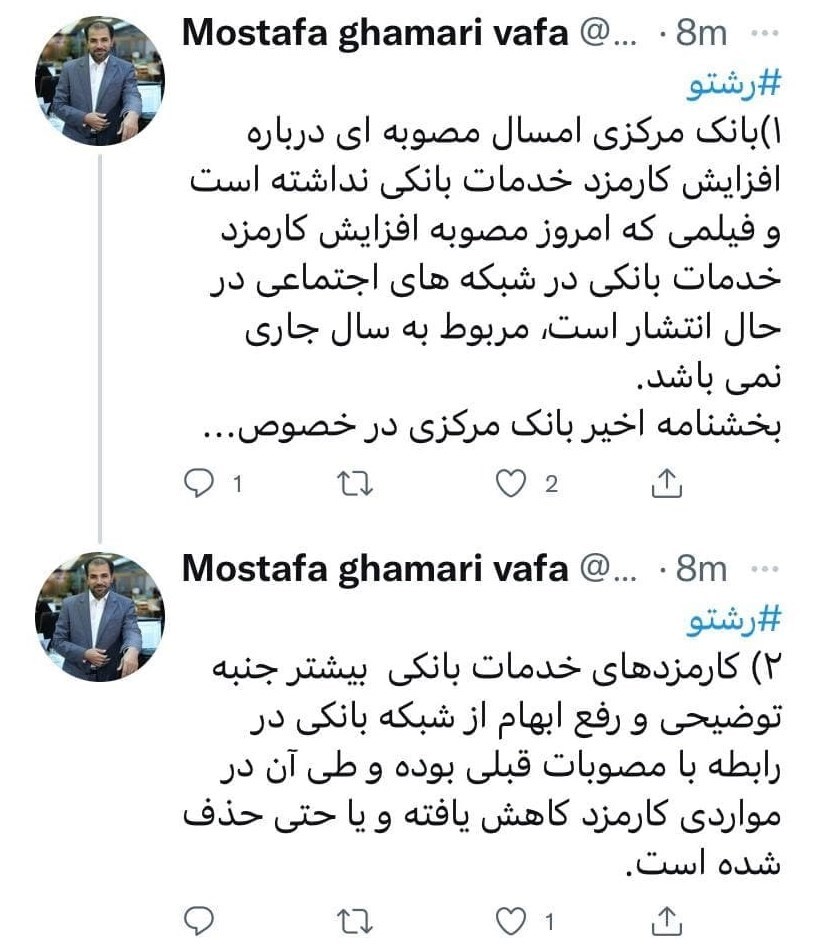 به گزارش سی نیوز به نقل از خبرگزاری تسنیم، مصطفی قمری وفا مدیرکل روابط عمومی بانک مرکزی نوشت: بانک مرکزی امسال مصوبه ای درباره افزایش کارمزد خدمات بانکی نداشته است و فیلمی که امروز با موضوع مصوبه افزایش کارمزد خدمات بانکی در شبکه های اجتماعی در حال انتشار است مربوط به سال جاری نمی باشد.