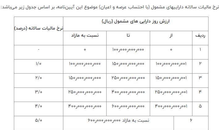 طبق بند خ تبصره ۶ قانون بودجه سال جاری واحدهای مسکونی و باغ ویلاهای گران‌قیمت به شرح بندهای زیر مشمول مالیات بر دارایی (سالانه) می‌شوند: