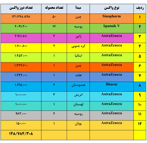 بیشترین حجم واردات واکسن با 131.5 میلیون دوز متعلق به سینوفارم چین است که تاکنون 50 محموله وارد کشور شده است.