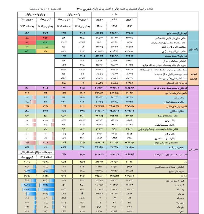 براساس این گزارش، موجودی اسکناس و سکه بانک مرکزی در این دوره، یک هزار و ۴۰۰ میلیارد تومان بوده که نسبت به شهریور سال گذشته ۵۰۰ میلیارد تومان کاهش و نسبت به اسفند سال گذشته ۲۰۰ میلیارد تومان افزایش داشت. از این موجودی اسکناس و سکه در بانک مرکزی، هر زمان که لازم باشد بنابر نیاز بازار تزریق خواهد شد.