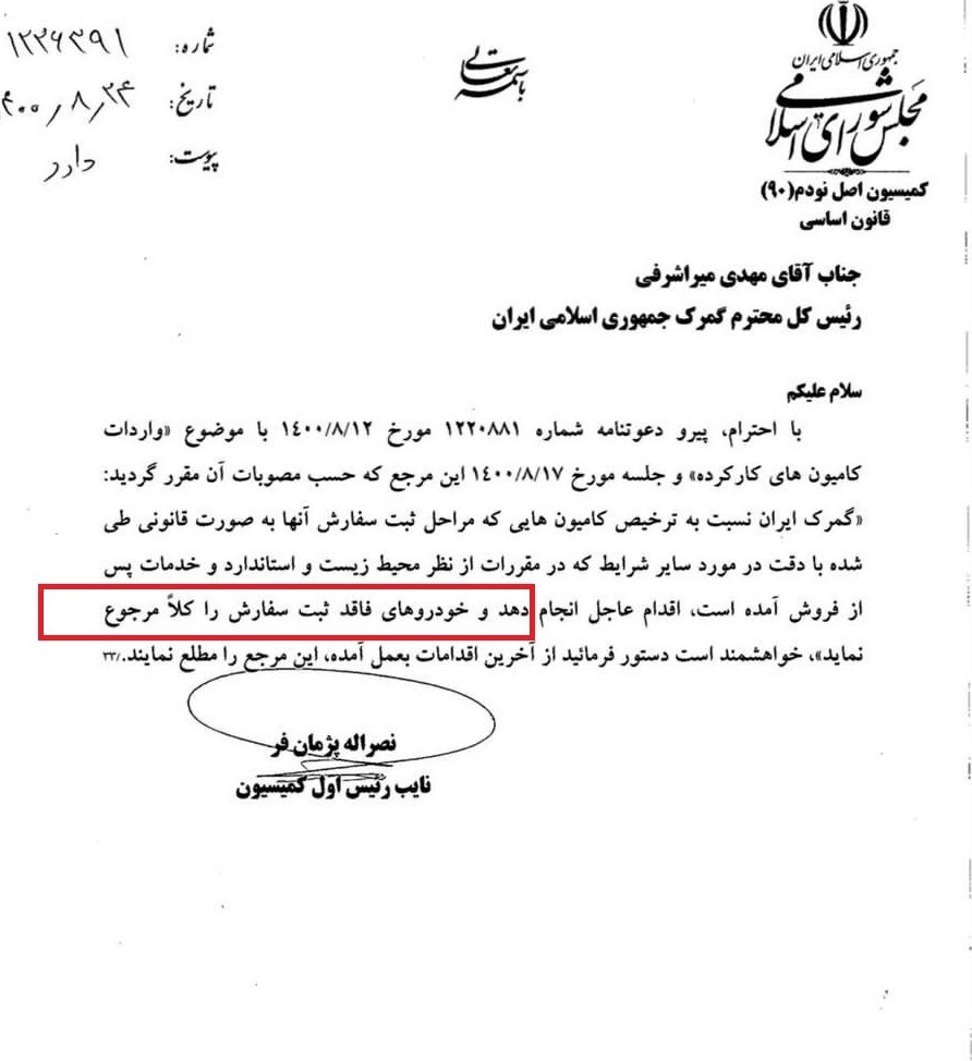 گفتنی است، نصرالله پژمان‌فر ، نایب رئیس اول کمیسیون اصل نود در مکاتبه با مهدی میراشرفی، رئیس کل گمرک جمهوری اسلامی ایران نوشت، با احترام پیرو دعوتنامه شماره 1220881 مورخ 1400.08.12 با موضوع واردات کامیون های کارکرده و جلسه مورخ 1400.08.17 این مرجع که حسب مصوبات آن مقرر گردید گمرک ایران نسبت به ترخیص کامیون هایی که مراحل ثبت سفارش آنها به صورت قانونی طی شده با دقت در مورد سایر شرایط که در مقررات از نظر محیط زیست و استاندارد و خدمات پس از فروش آمده است اقدام عاجلی انجام دهد و خودروهای فاقد ثبت سفارش را کلاً مرجوع نماید. خواهشمند است دستور فرمایید از آخرین اقدامات به عمل آمده این مرجع را مطلع نمایید.