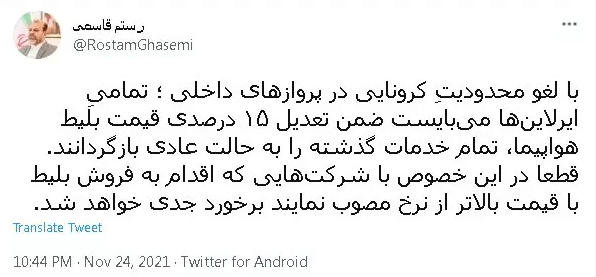 وزیر راه و شهرسازی در توئیتی نوشت: با لغو محدودیت کرونایی در پروازهای داخلی تمامی ایرلاین‌ها می‌بایست ضمن تعدیل ۱۵ درصدی قیمت بلیط هواپیما، تمام خدمات گذشته را به حالت عادی بازگردانند.