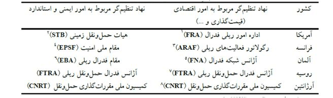 جدول زیر به معرفی نهادهای تنظیم گر در برخی کشورهای ریلی می پردازد