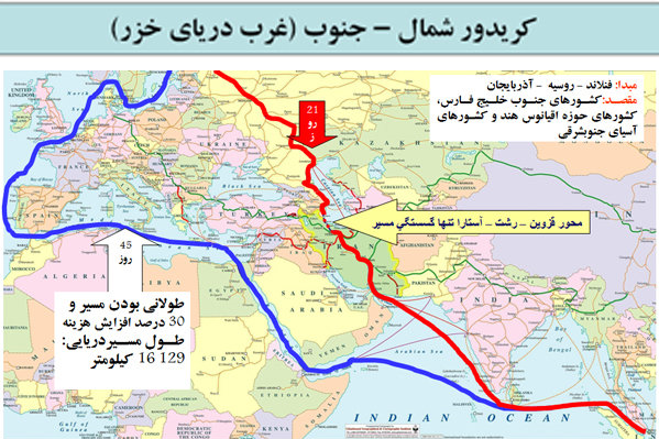 در تصویر 2 مسیر قرمز رنگ، کریدور شمال- جنوب بر پایه حمل و نقل ترکیبی بوده و مسیر آبی رنگ، مسیر سنتی تجارت اروپا- آسیا بر پایه حمل و نقل دریایی است.