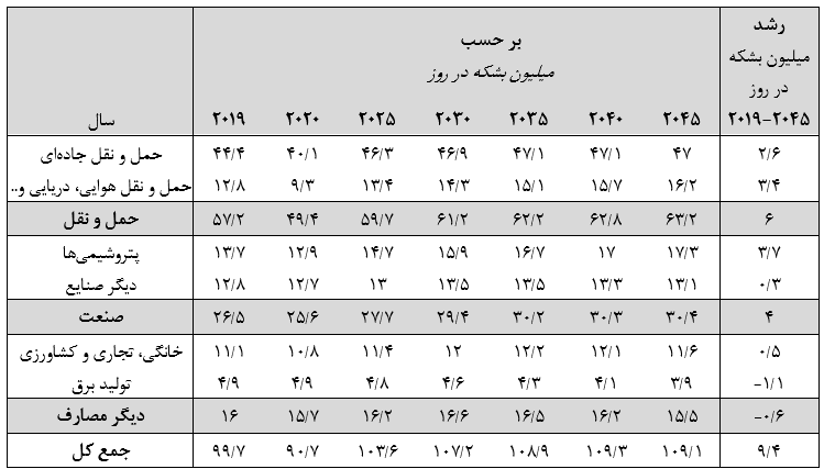 مطابق جدول 1 رشد مصرف نفت در بخش حمل و نقل جادهای در سال 2045 میلادی متوقف خواهد شد و روی رقم 47 میلیون بشکه در روز ثابت خواهد شد. یکی از دلایل این موضوع متنوع شدن سبد سوختی خودروها در سالهای آینده است.
