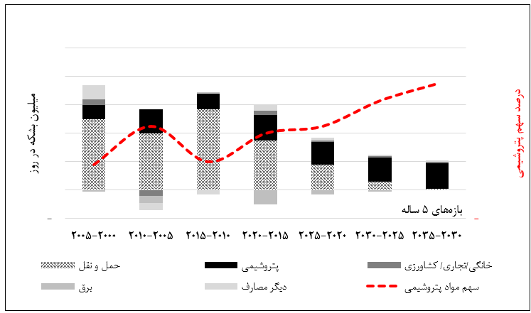 رشد تقاضا برای مصرف نفت در بخش پتروشیمی از حدود 20 درصد در دوره 5 ساله 2000-2005 میلادی به حدود 80 درصد در دوره 5 ساله 2030-2035 میلادی خواهد رسید (محور سمت راست تصویر 1) و رشد تقاضای نفت در حوزه حمل و نقل تا سال 2035 میلادی کاهش خواهد یافت و نزدیک صفر خواهد شد و عمده رشد مصرف نفت خام مربوط به صنعت پتروشیمی خواهد بود.