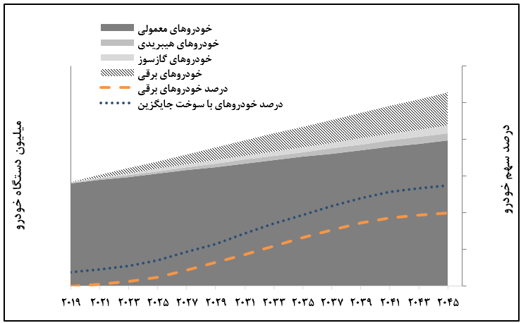 مطابق تصویر 2 (محور سمت راست) در سال 2045 میلادی حدود 22 درصد از خودروهای دنیا از سیستمهای محرکه جایگزین جدید بهره خواهند برد که 16 درصد از این 22 درصد سهم خودروهای برقی است و تا سال 2045 میلادی مجموع خودروهای دنیا از 2.5 میلیارد خودرو عبور خواهد کرد.