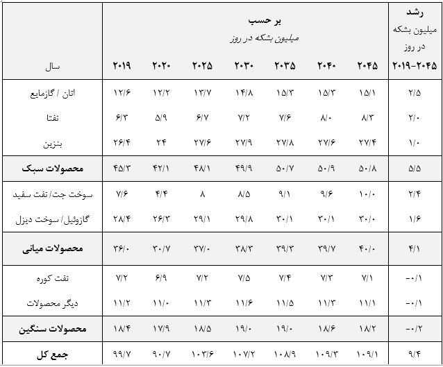 مجموعا مصرف نفت و میعانات گازی در مصارف حمل و نقل، صنعت و غیره از 99.7 میلیون بشکه در روز در سال 2019 میلادی به 109.1 میلیون بشکه در روز تا سال 2045 میلادی خواهد رسید.