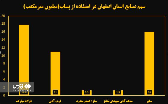 با توجه به آمار ارائه شده، میزان پساب تصفیه شده بدون استفاده در استان اصفهان معادل 138.6 میلیون متر مکعب است. علاوه بر این میزان آب مورد استفاده صنعت در حوضه آبریز زاینده رود بر مبنای آخرین آمار در سال آبی 1399-1400 معادل 49 میلیون متر مکعب بوده است.