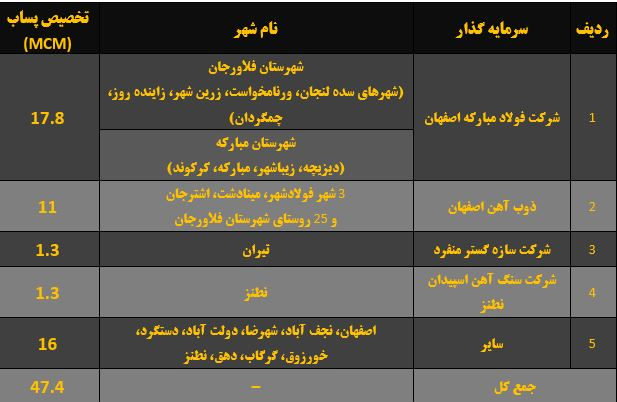 در این راستا شرکت فولاد مبارکه اصفهان با 17.8 میلیون مترمکعب در سال با میزان سرمایهگذاری 6 هزار و 360 میلیاردریال طی 2 قرارداد در شهرهای فلاورجان (سال بهرهبرداری 1396) و شهرستان مبارکه (سال بهرهبرداری 1398) به همراه شرکت ذوب آهن اصفهان با 11 میلیون مترمکعب در سال با میزان سرمایهگذاری 4 هزار 990 میلیارد ریال در 3 شهر فولادشهر، مینادشت، اشترجان و 25 روستای شهرستان فلاورجان از پساب تصفیه شده استفاده میکنند.