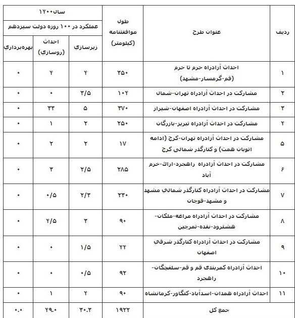 علاوهبر این در حوزه روسازی (احداث) نیز 4 کیلومتر احداث آزادراه حرم تا حرم (قم-گرمسار-مشهد)، 33 کیلومتر مشارکت در احداث آزادراه اصفهان-شیراز، یک کیلومتر مشارکت در احداث آزادراه تبریز-بازرگان، 2 کیلومتر مشارکت در احداث آزادراه تهران-کرج (ادامه اتوبان همت) و کنارگذر شمالی کرج، 3 کیلومتر مشارکت در احداث آزادراه راهجرد-اراک-خرمآباد، 0.5 کیلومتر مشارکت در احداث آزادراه کنارگذر شمالی مشهد و مشهد- قوچان، 4.5 کیلومتر مشارکت در احداث آزادراه مراغه-ملکان-هشترود-نقده-تمرچین و یک کیلومتر احداث آزادراه همدان-اسدآباد-کنگاور-کرمانشاه، مجموع روسازیهای انجام شده در سه ماه نخست فعالیت دولت سیزدهم در حوزه آزادراهها هستند.