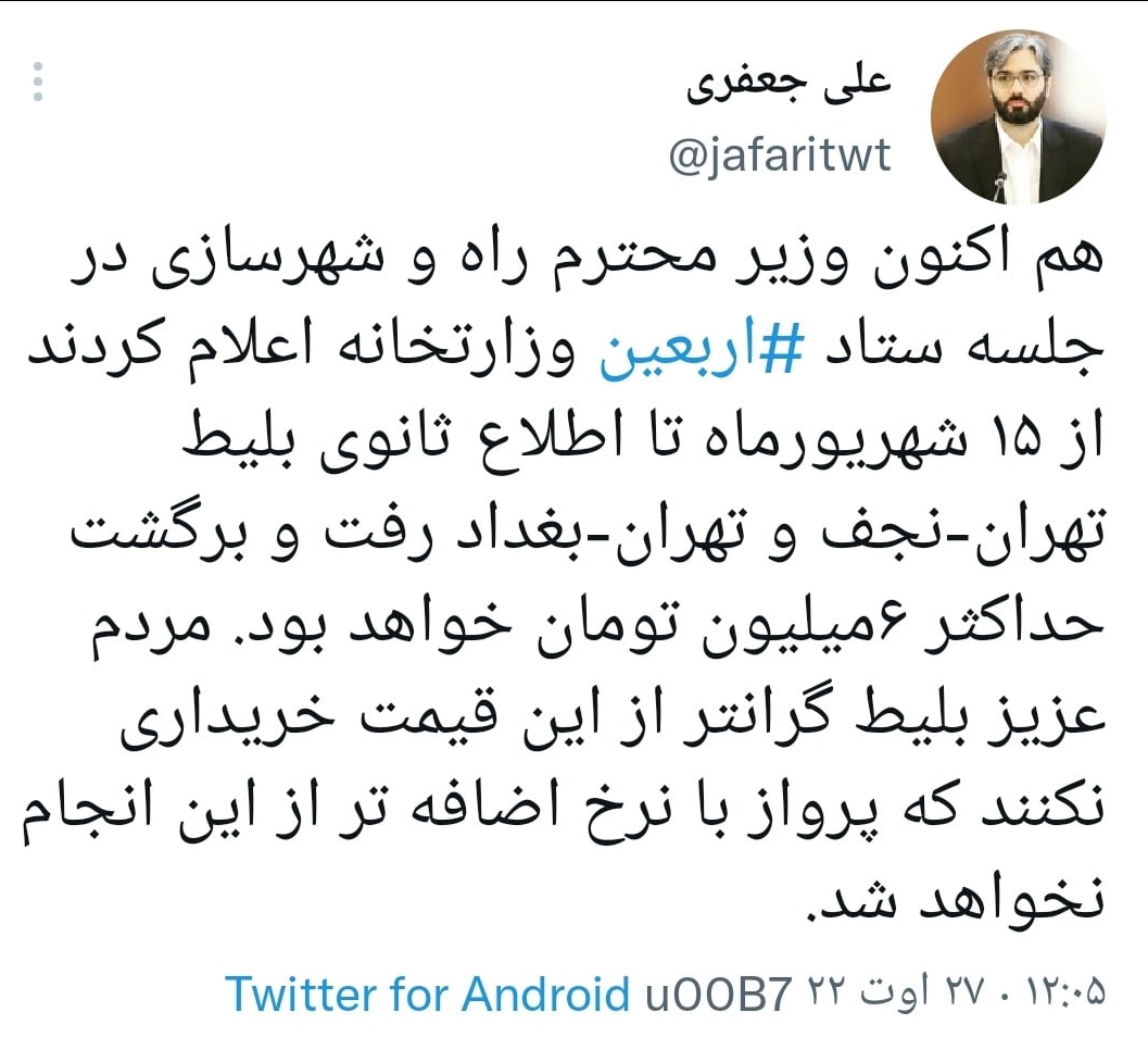 در حالی که کاپیتان محمد محمدی بخش در نشست خبری چهارشنبه ۲ شهریور از برگزاری پروازهای اربعین طی بازه ۲۰ تا ۳۱ شهریور امسال با نرخ رفت و برگشت ۶ میلیون تومان خبر داده بود، علی جعفری مدیرکل حوزه وزارت راه و شهرسازی دقایقی قبل در صفحه شخصی خود در فضای مجازی از دستور رستم قاسمی وزیر راه و شهرسازی در نشست ستاد اربعین امروز شنبه شهریور مبنی بر فروش بلیت همه پروازهای رفت و برگشت تهران-نجف-تهران و تهران-بغداد-تهران با قیمت ۶ میلیون تومان از سه شنبه ۱۵ شهریور خبر داد.