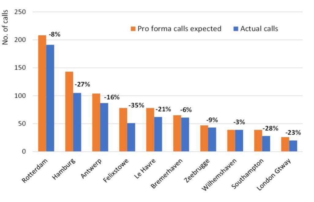 در این راستا ائتلاف THE Alliance در سه ماهه سوم سال ۲۰۲۲ کمترین تماس بندری را داشته و به طور کلی تماسهای برنامه ریزی شده بنادر اروپای شمالی در این مدت ۲۶ درصد نسبت به سال قبل کاهش نشان میدهد.