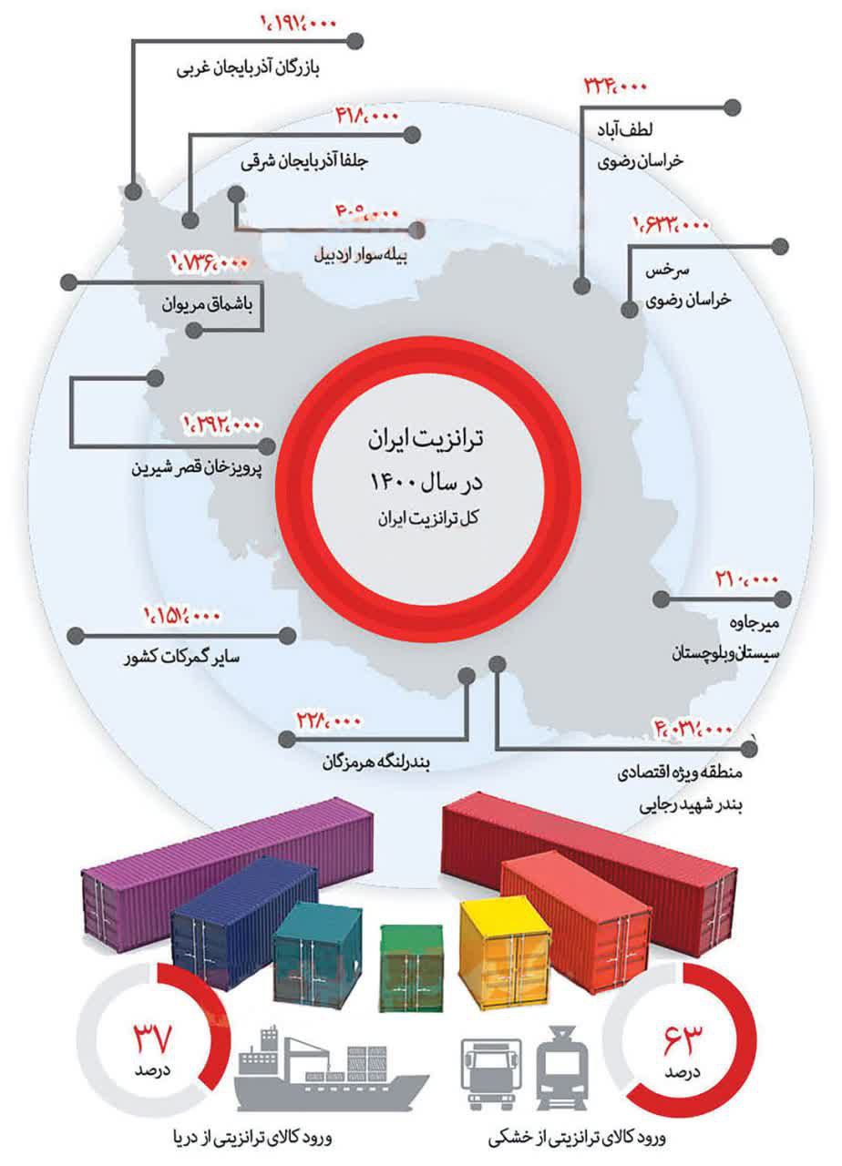 براساس آمارهای رسمی، در سال گذشته 37درصد از کالای ترانزیتی از دریا و 63درصد از مسیر خشکی وارد ایران شده است که از مجموع ترانزیت زمینی حدود 24درصد از مرز عراق، 15.5درصد از مرز
