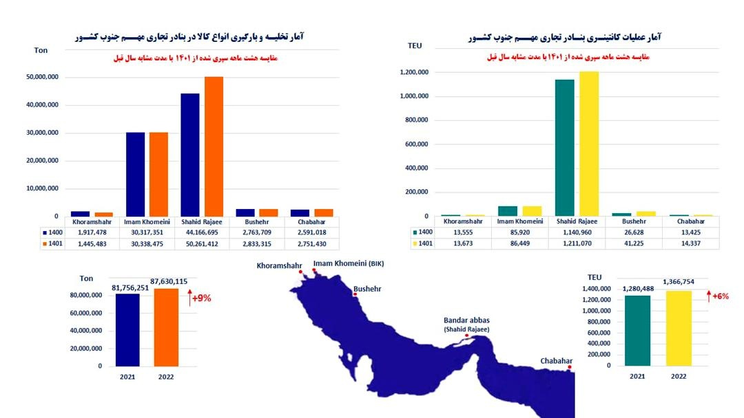عملکرد تناژی و کانتینری بنادر مهم تجاری جنوب ایران در هشت ماه سپری شده از سال ۱۴۰۱ توسط سازمان بنادر و دریانوردی منتشر شد.