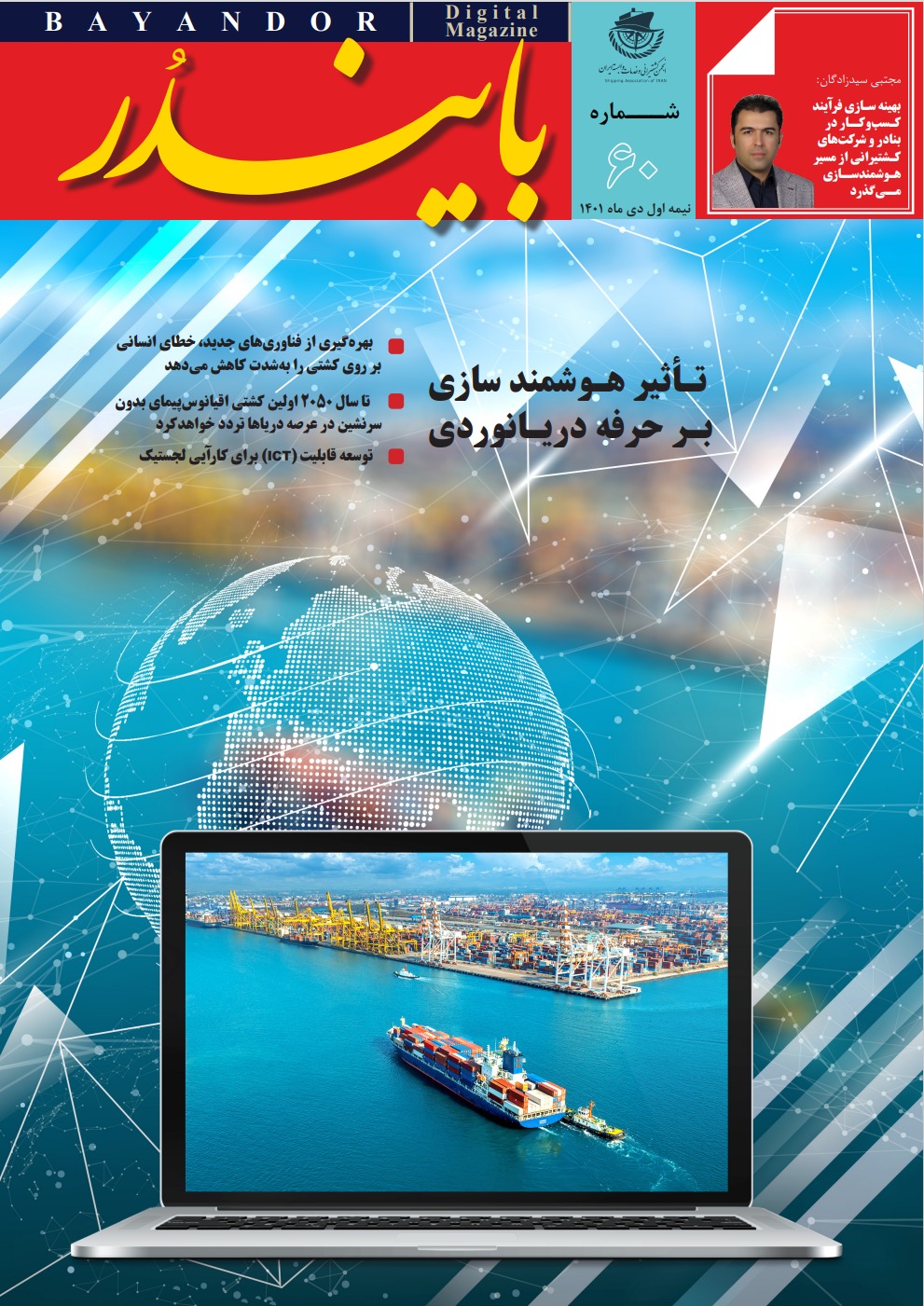گفتنی است در این شماره گفت‌وگو با مجتبی سیدزادگان، عضو کمیته مشورتی تحول دیجیتال و IT انجمن کشتیرانی و خدمات وابسته ایران درباره زیرساخت ها و آخرین وضعیت هوشمندسازی ناوگان حمل و نقل دریایی و بندری و گزارشی درباره آسیب های قطعی و محدودیت اینترنت به مشاغل دریایی و سایر مطالب مرتبط منتشر شده است.