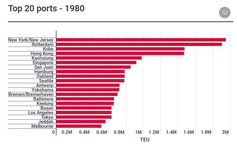 در اوایل دهه ۱۹۸۰، در حالی که بنادر اصلی در آمریکا و اروپای شمالی همچنان بزرگترین حجم حمل و نقل را سالانه ثبت میکردند ؛ با رتردام به عنوان بزرگترین بندر جهان نیویورک-نیوجرسی را کنار زده و همزمان بنادر آسیای شرقی شروع به رشد سریع کردند.