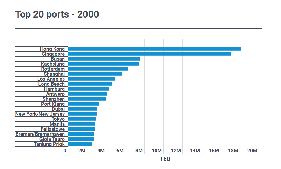در اواخر دهه ۱۹۹۰، چین شروع به سرمایهگذاری سنگین در زیرساختهای بنادر کرد. ترمینالهای کانتینری بزرگی در سراسر سواحل آن توسعه یافتند که به تجارت صادراتی پر رونق کمک کردند و چین به عنوان کارخانه جهان شناخته شد.