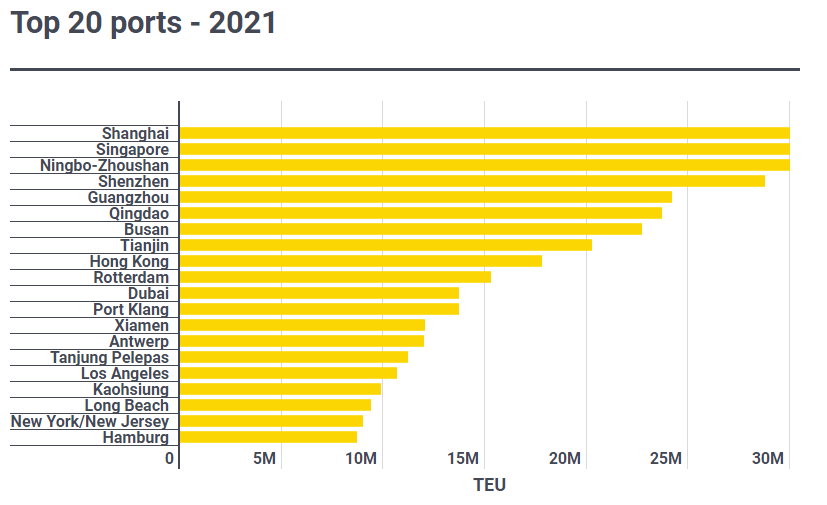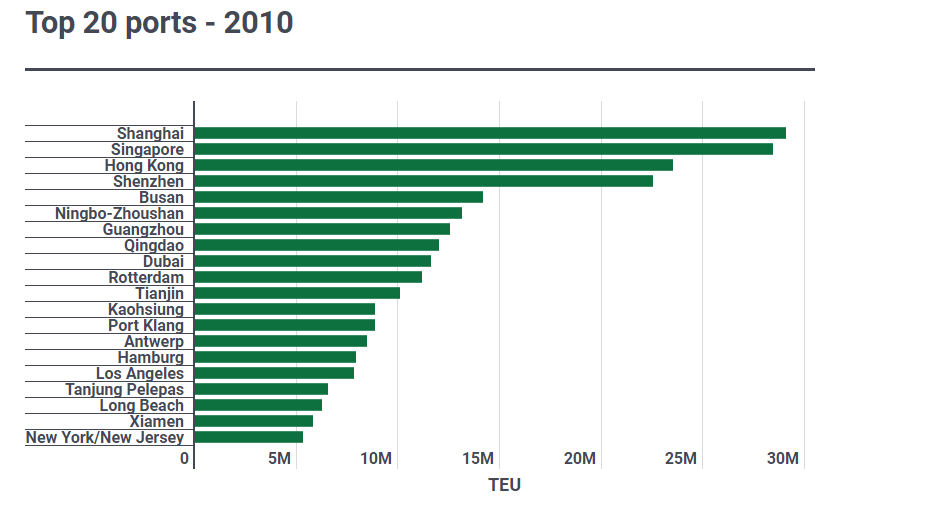 در سال ۲۰۱۰، شانگهای سنگاپور را به عنوان بزرگترین بندر کانتینری جهان جایگزین کرد ، که تا به امروز اینطور مانده است و حداقل شش بندر چینی در میان بزرگترین بنادر جهان در اصطلاحات حجم سالانه حمل و نقل قرار دارد.