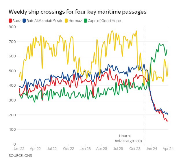 همچنین، این گزارش می گوید که حملات دریای سرخ توسط مبارزان حوثی یمن ، باعث این ضربه به اقتصاد کشور های اروپایی شده و بسیاری از شرکتهای حمل و نقل بزرگ مسیرهای خود را به سوی کیپ آفریقا(Cape of Good Hope) تغییر داده اند که این تغییرات باعث افزایش هزینههای بیمه، سوخت و دستمزد شده است که در نتیجه به افزایش نرخ تورم در کشورهای اروپایی و به ویژه در اقتصاد انگلستان منجر گردیده است.