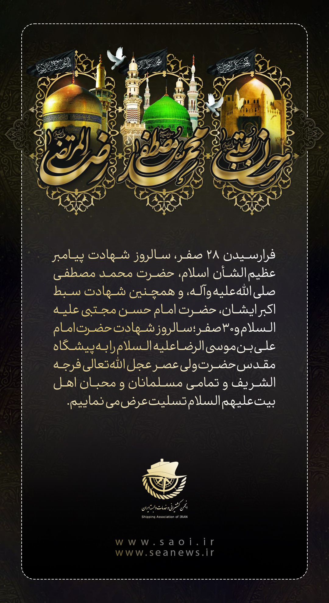 فرارسیدن ۲۸ صفر، سالروز شهادت پیامبر عظیمالشأن اسلام، حضرت محمد مصطفی صلیاللهعلیهوآله، و همچنین شهادت سبط اکبر ایشان، حضرت امام حسن مجتبی علیهالسلام و30 صفر؛ سالروز شهادت حضرت امام علی بن موسیالرضا علیهالسلام را به پیشگاه مقدس حضرت ولیعصر عجلاللهتعالیفرجهالشریف و تمامی مسلمانان و محبان اهل بیت علیهمالسلام تسلیت عرض مینماییم.