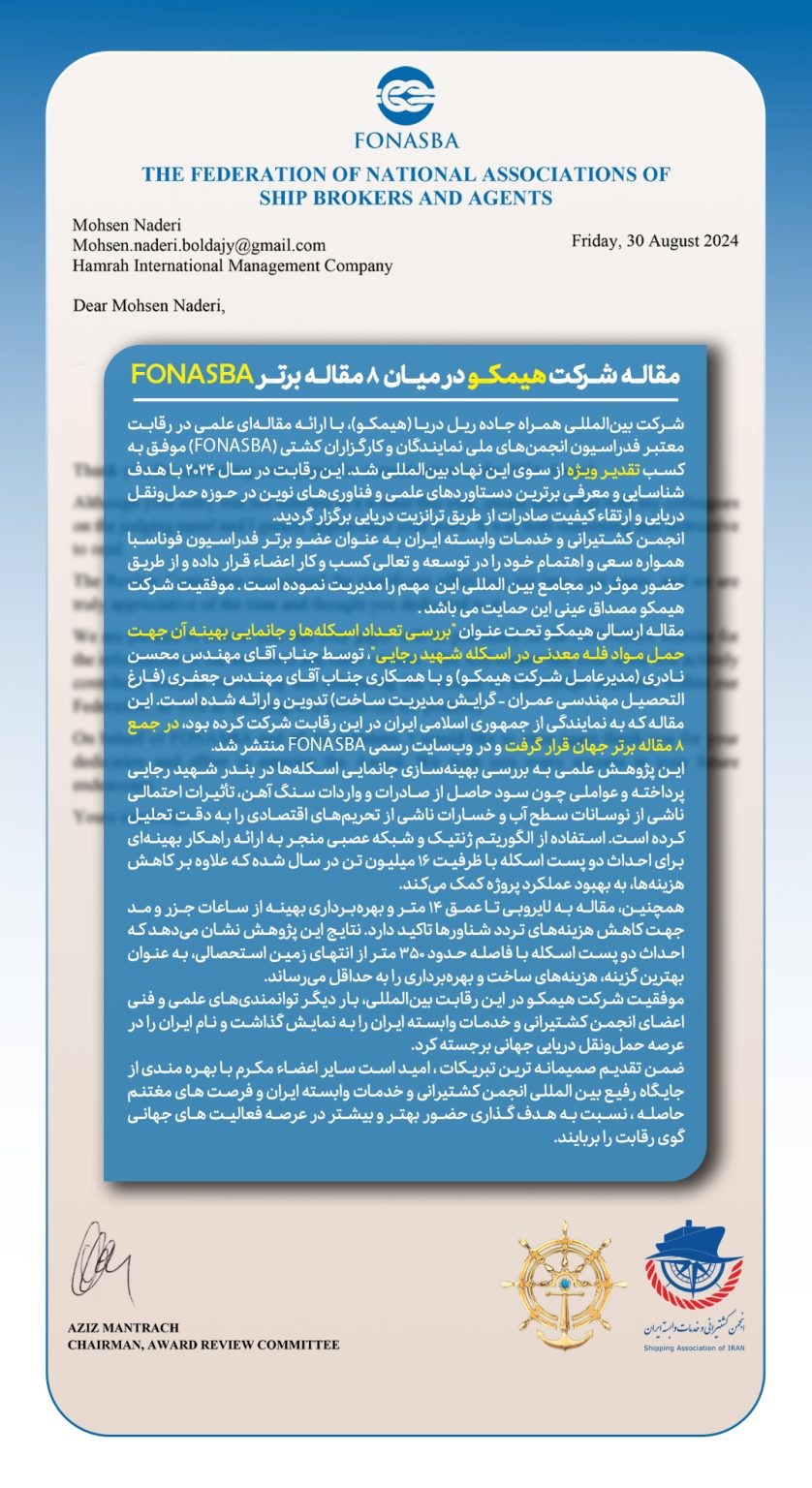 مقاله ارسالی هیمکو تحت عنوان بررسی تعداد اسکله‌ها و جانمایی بهینه آن جهت حمل مواد فله معدنی در اسکله شهید رجایی، توسط جناب آقای مهندس محسن نادری (مدیرعامل شرکت هیمکو) و با همکاری جناب آقای مهندس جعفری (فارغ‌التحصیل مهندسی عمران – گرایش مدیریت ساخت) تدوین و ارائه شده است. این مقاله که به نمایندگی از جمهوری اسلامی ایران در این رقابت شرکت کرده بود، در جمع ۸ مقاله برتر جهان قرار گرفت و در وب‌سایت رسمی FONASBA منتشر شد.