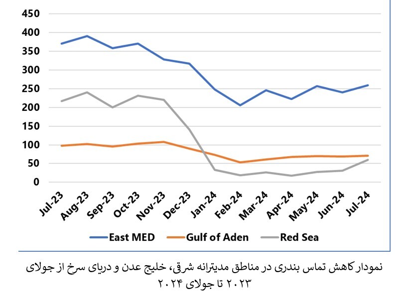 در این گزارش آمده است که میانگین تماسهای بندری در این مناطق به طور متوسط از ۲۰۰ بار در ماه به کمتر از ۴۰ مورد از ژانویه تا پایان ماه ژوئن کاهش یافته است. این رقم در ماه جولای ۲۰۲۴ میلادی به ۶۰ تماس رسید. تحلیلگران بر این باورند که این افزایش موقتی است و پیشبینی خوشبینی برای افزایش ارقام در این زمینه کمتر است.