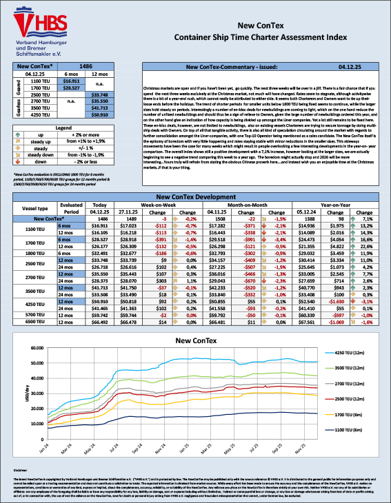 سی نیوز-* بر اساس دادههای تازه منتشرشده توسط اتحادیه کارگزاران کشتی هامبورگ و برمن (VHBS)، شاخص کل New ConTex با رسیدن به عدد ۱۴۸۶، کاهش جزئی ۰.۲ درصدی نسبت به هفته گذشته را تجربه کرده است. این گزارش که در آستانه تعطیلات سال نو میلادی ارائه شده، تصویری از بازاری نسبتاً باثبات اما در حال تغییر ارائه میدهد.