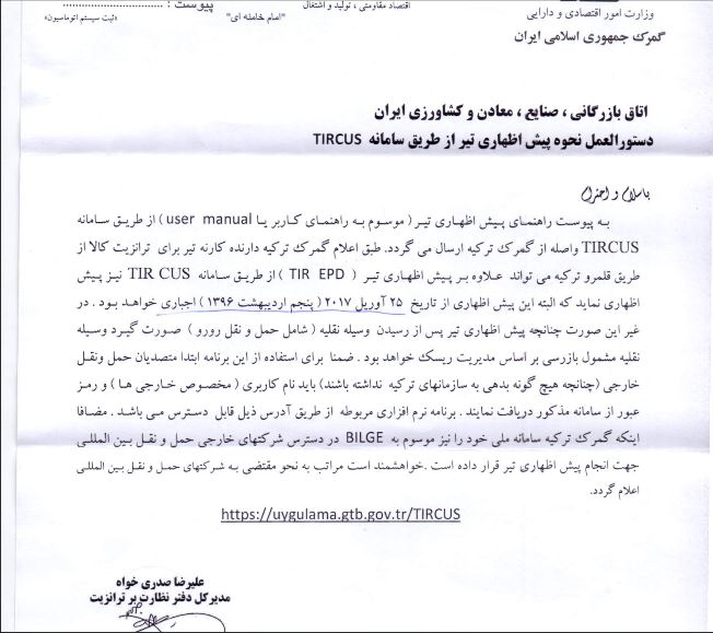 به گزارش سی نیوز مدیر کل دفتر نظارت بر ترانزیت گمرک جمهوری اسلامی ایران بخشنامه ای را تحت عنوان “دستورالعمل نحوه پیش اظهاری تیر از طریق سامانهTIRCUS ” به شرکتهای کشتیرانی ابلاغ نموده اند که به شرح زیر میباشد :