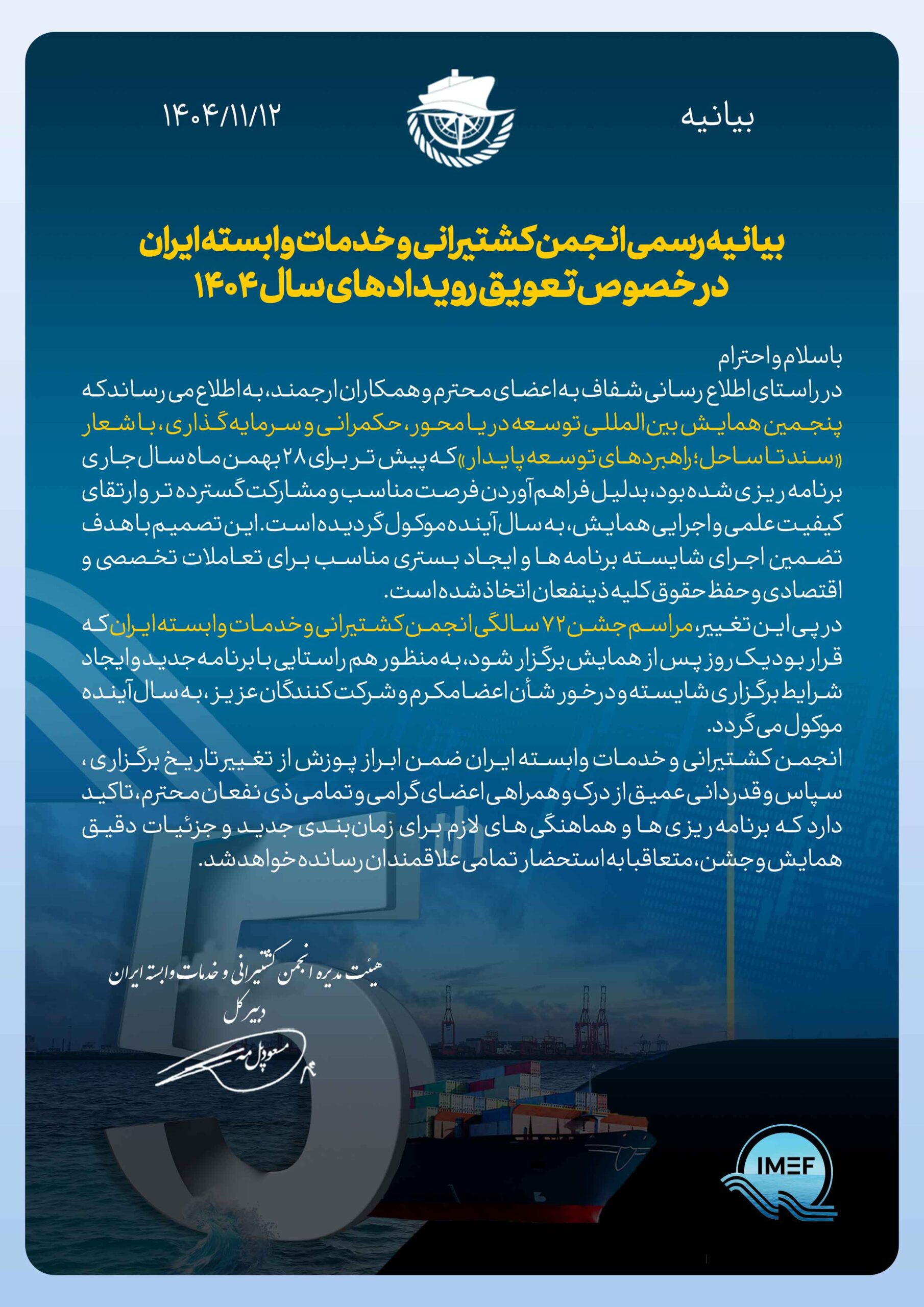 انجمن کشتیرانی و خدمات وابسته ایران ضمن ابراز پوزش از تغییر تاریخ برگزاری، سپاس و قدردانی عمیق از درک و همراهی اعضای گرامی و تمامی ذینفعان محترم، تاکید دارد که برنامهریزیها و هماهنگیهای لازم برای زمانبندی جدید و جزئیات دقیق همایش و جشن، متعاقباً به اطلاع تمامی علاقمندان رسانده خواهد شد.