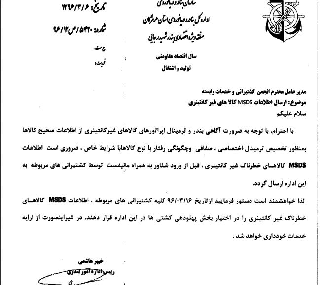 به گزارش سی نیوز رئیس اداره بنادر ودریانوردی استان هرمزگان بخشنامه ای به شرکت های کشتیرانی در خصوص لزوم ارسال اطلاعات MSDS کالاهای غیرکانتینری به شرح زیر ابلاغ نموده اند :