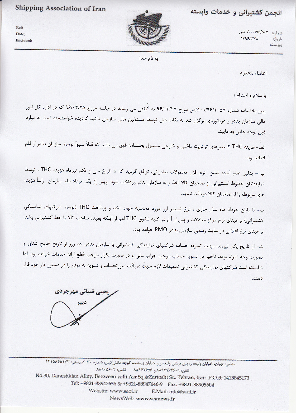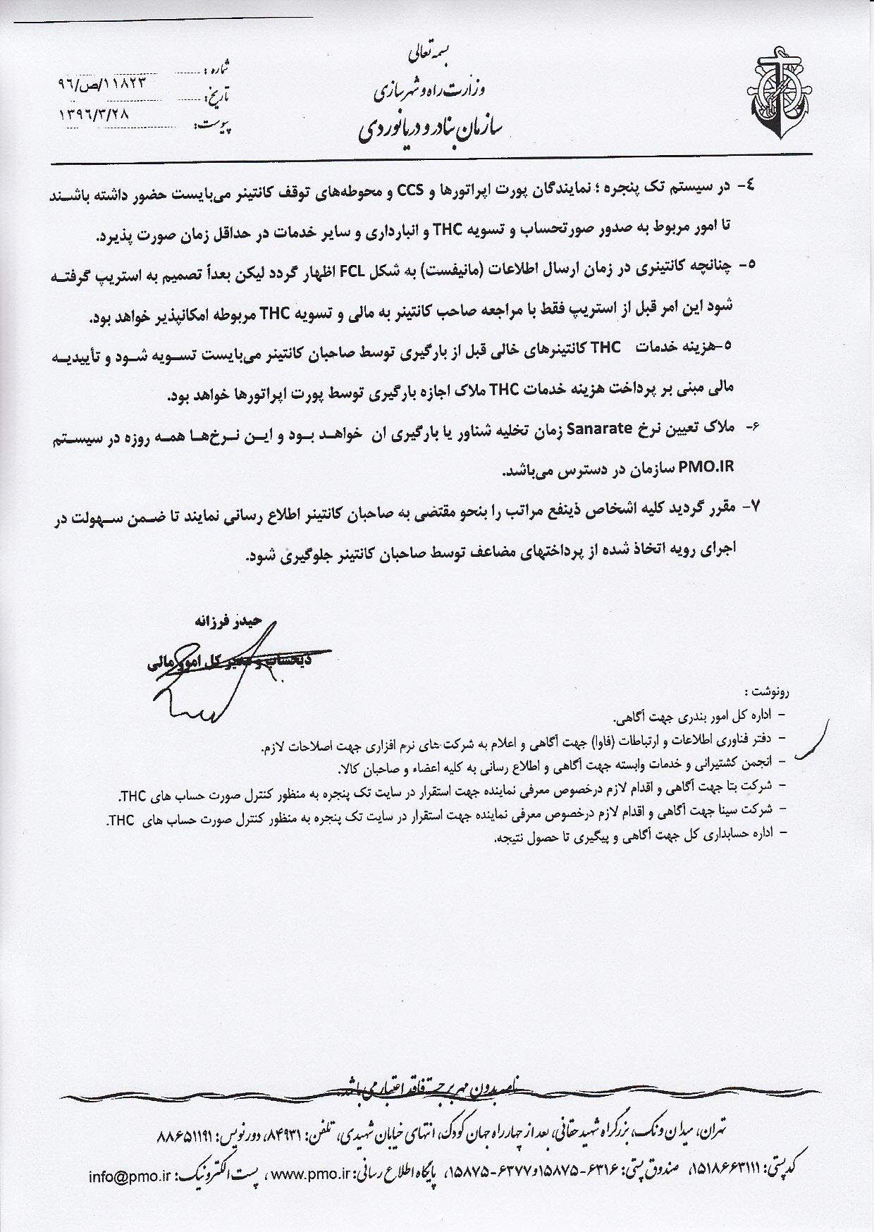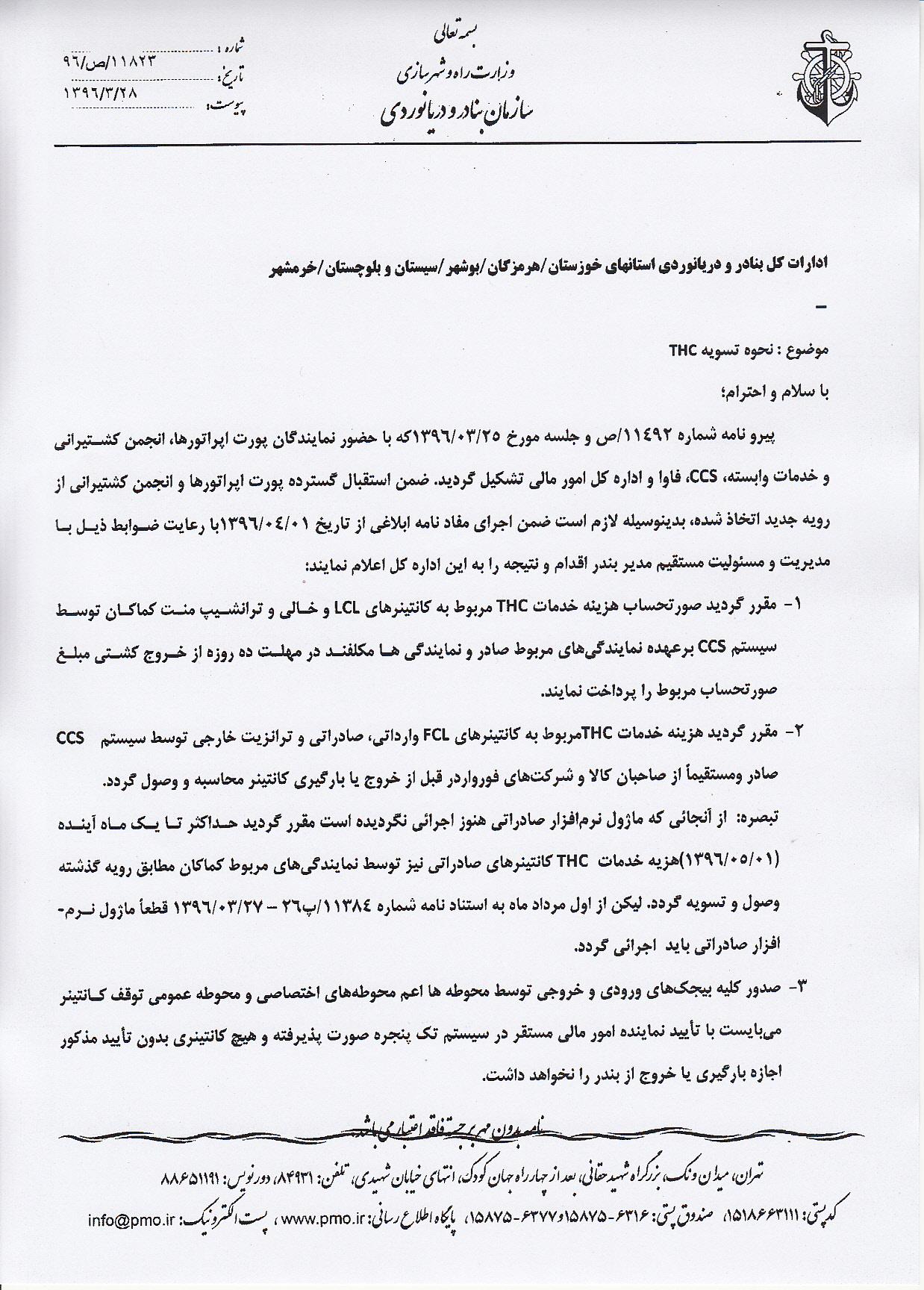 همچنین در ادامه ذیحساب و مدیر کل امور مالی سازمان نیز ابلاغیه ای به ادارات کل بنادر و دریانوردی استانهای خوزستان ، هرمزگان ، بوشهر ، سیستان بلوچستان ، خرمشهر در خصوص نحوه تسویه THC به شرح زیر ارسال نموده که عیناً تقدیم میگردد :