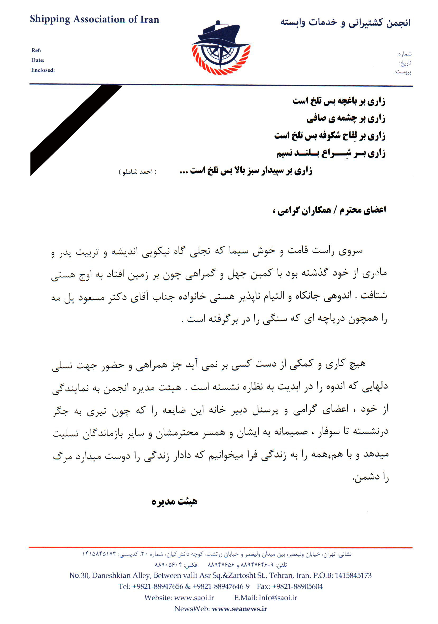 انجمنها و اتحادیهها تسلیت به دبیر محترم انجمن کشتیرانی و خدمات وابسته به اشتراک گذاری به اشتراک گذاری FacebookTwitterGoogle+ReddItWhatsAppPinterestپست الکترونیک