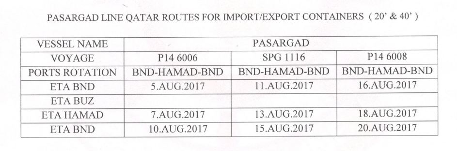 بنا بر این گزارش خط کشتیرانی PASARGADLINE با در اختیار داشتن سه فروند شناور با ظرفیت TEU (95-108-45) با قابلیت ارائه سرویس دهس کانتینری معمولی و یخچالی با برنامه هفتگی منظم ، مستقیم و از پیش تعیین شده از بندر عباس و بوشهربه بندر حمد قطر میباشد . این شرکت قادر به ارائه سرویس های ترانشیپی نیز میباشد .
