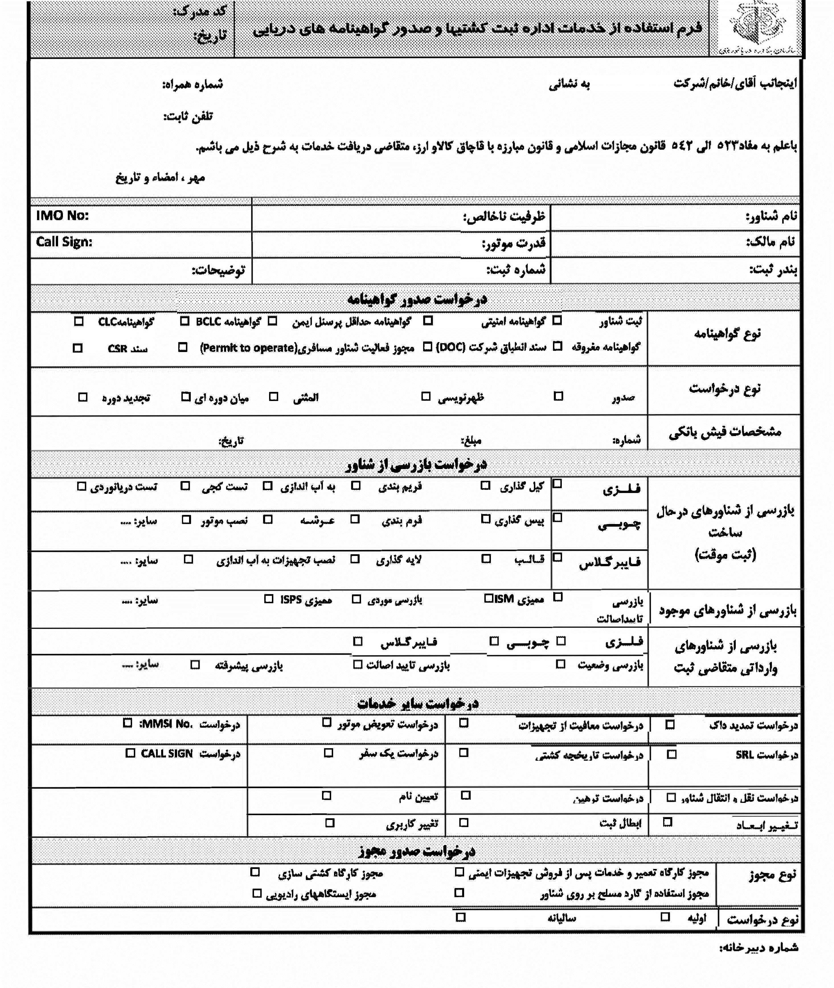 متقاضیان باید بسته به نوع درخواست فرم مذکور را پر نموده و به دبیرخانه ادارات بازرسی و ثبت شناور تحویل نمایند .