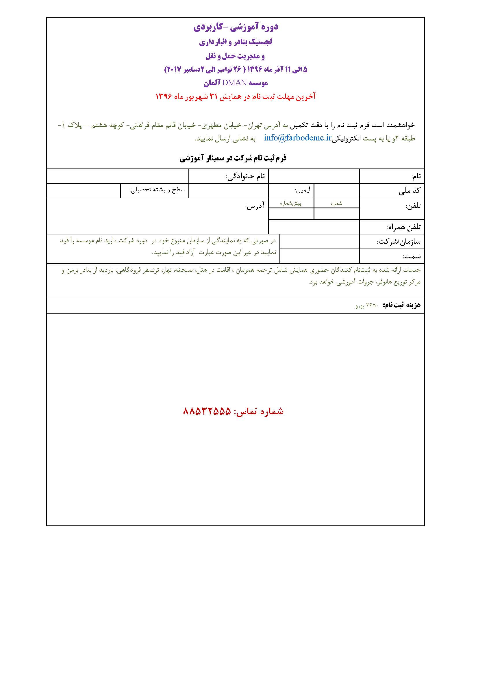 آخرین خبر دوره آموزشی – کاربردی لجستیک بنادر و انبارداری و مدیریت حمل و نقل در آلمان برگزار میگردد به اشتراک گذاری به اشتراک گذاری FacebookTwitterGoogle+ReddItWhatsAppPinterestپست الکترونیک