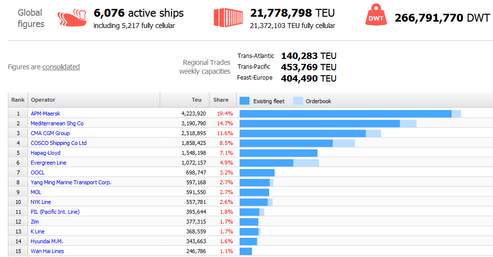 به گزارش پایگاه خبری سی نیوز، در گزارش اخیر آلفالاینر 10 شرکت بزرگ دنیا بدون تغییر نسبت به ماه های پایانی سال 2017 میلادی، همچنان جایگاه خود را بدون تغییر حفظ کرده اند. در این رده بندی، ای.پی.ام مرسک با 783 فروند کشتی و مجموع 4 میلیون و 233 هزار 920 TEU کانتینر در جایگاه نخست قرار دارد و سهم حمل ونقلی 19 درصدی را از آن خود کرده است. پس از آن، شرکت مدیترانه ای با 510 فروند کشتی و 3 میلیون و 190 هزار و 790 TEU کانتینر در رتبه دوم است و جایگاه بعدی نیز به شرکت سی.ام.ای سی.جی.ام با 496 فروند کشتی و مجموع 2 میلیون 518 هزار و 895 TEU کانتینر می رسد.